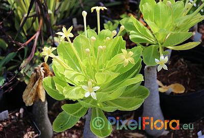 90 (150)cm, Hawaiian Volcano Palm is a very unusual, in habitat extinct, most ornamental caudex plant with a massive, unbranched, grayish green stem and a dense crown of large, spoon shaped, fresh green, glossy leaves. It produces pale yellow, trumpet shaped and very long stalked flowers. The Hawaiian Volcano Palm is easily cultivated in any very well drained substrate in a sunny (winter) to partially shaded (summer) spot at a minimum of some 10°C. Brighamia insignis is usually not self pollinating, which has lead to its extinction in habitat, as its natural pollinator (a hawk moth) had become extinct and an artificial pollination program was also stopped. VIII-X. |