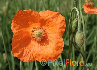 100cm, Atlas Poppy is a perennial species with numerous bright orange flowers on long stalks above broadly lobed, fresh bluish green to yellowish green, coarsely pubescent leaves in a dense rosette. Native of the Atlas Mountains, Morocco. For any rich, well drained soil in a sunny spot. Seed from a mostly double petaled (i.e. semi-filled) form. IV-VI. |